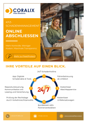 CORALIX Fleet Solutions – der erste Fuhrparkdienstleister der Branche mit 100 % digitalem Online-Abschluss. FleetProtect – Die 360° Lösung für Schaden- und Versicherungsmanagement.