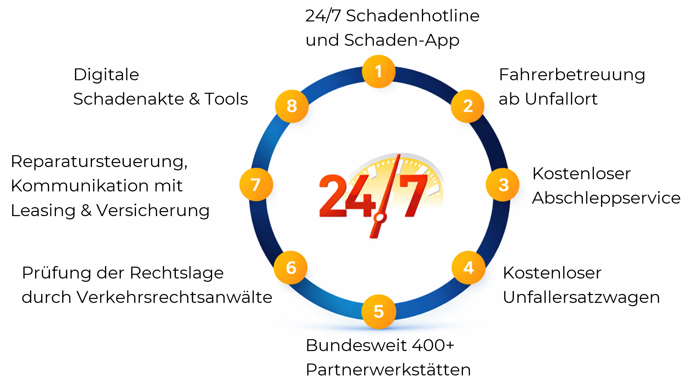 - Bundesweit 400+ Partnerwerkstätten: Mit über 400 qualitätsgeprüften Partnerwerkstätten in ganz Deutschland garantieren wir eine flächendeckende, schnelle und professionelle Schadenabwicklung – unabhängig vom Standort Ihres Fahrzeugs.